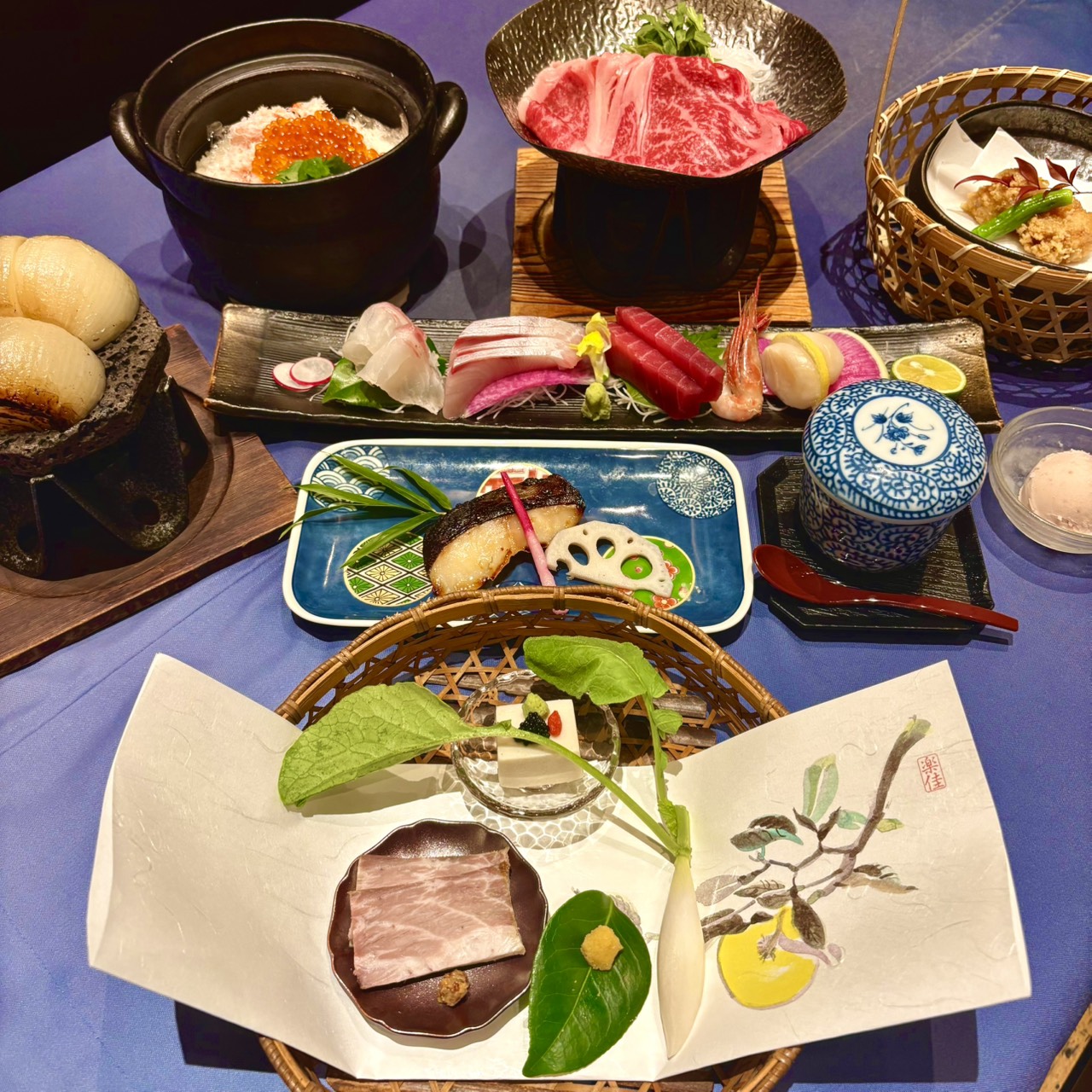 *仕入れ状況により内容が異なる場合がございます 【先 付】胡麻豆腐 細根大根 カラスミ ローストポーク 【お造り】お造り5種盛 【名 物】淡路玉ねぎ溶岩焼 【焼 物】銀ダラ西京焼 蓮根 はじかみ 【鍋】淡路牛すき焼き 【蒸 物】白子茶碗蒸し 【揚 物】鮟鱇唐揚げ 【食 事】蟹といくら土釜飯 【甘 味】苺アイス |