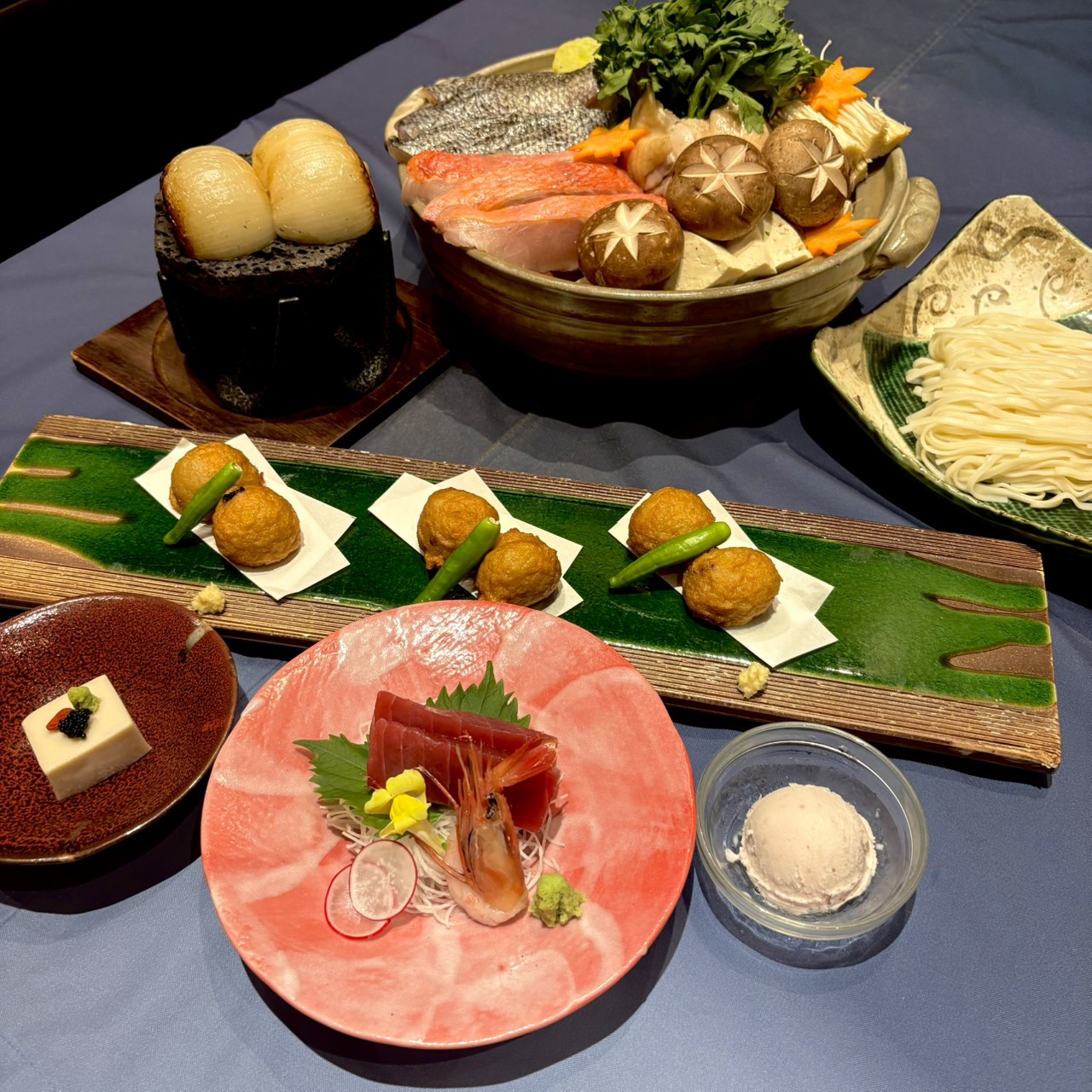 *仕入れ状況により内容が異なる場合がございます 【先 付】胡麻豆腐 旨出汁 山葵 クコの実 ランプフィッシュキャビア 【お造り】お造り2種盛り 【名 物】淡路玉ねぎ溶岩焼 【蒸 物】 茶碗蒸し 【揚 物】淡路蛸さつま揚げ 【鍋】淡路直送海鮮鍋 【食 事】淡路名産平野うどん 【甘 味】苺アイス |